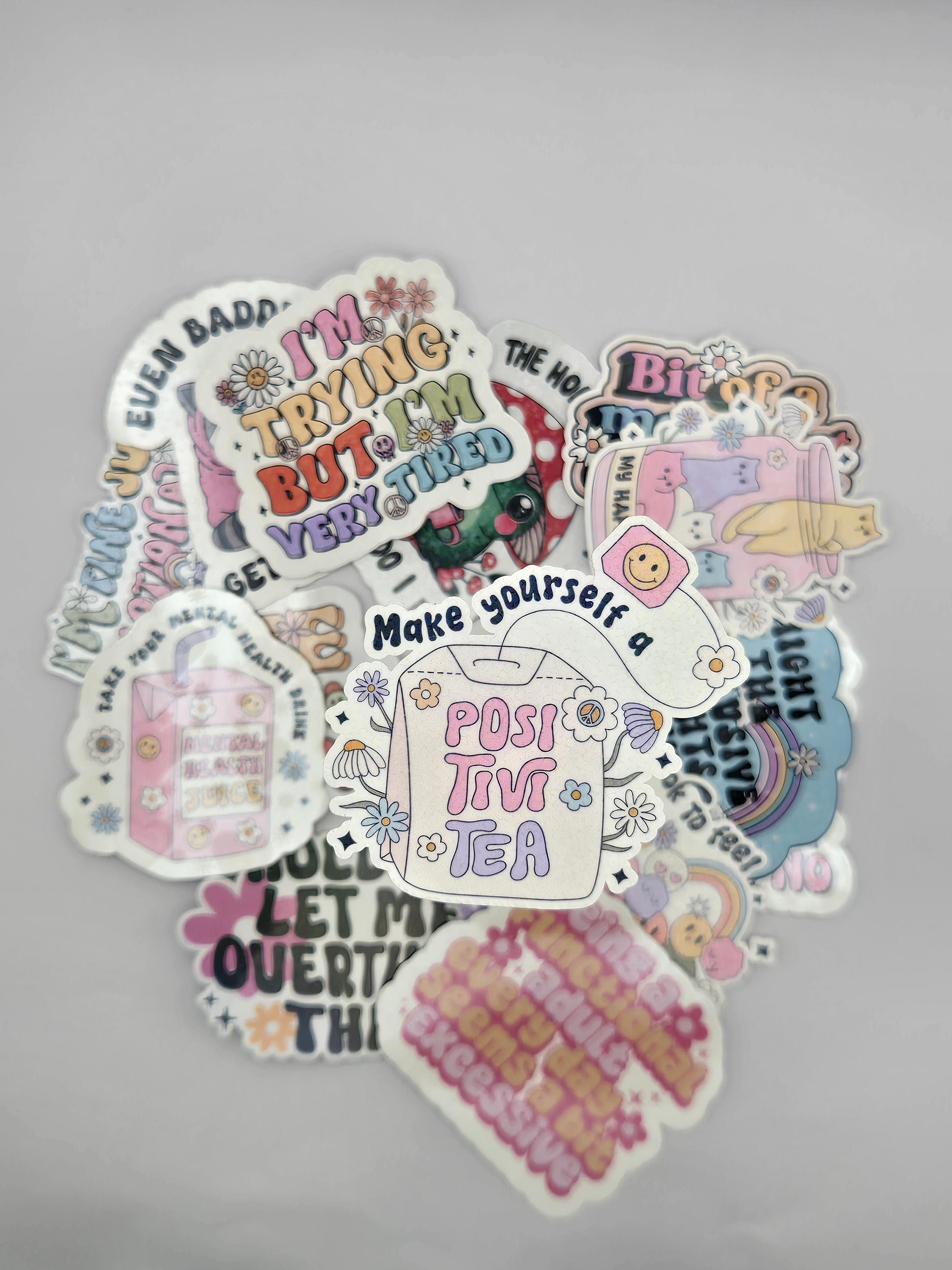 Shiny, positive, and full of good vibes, our holographic mental health stickers are designed to make you smile. ✨