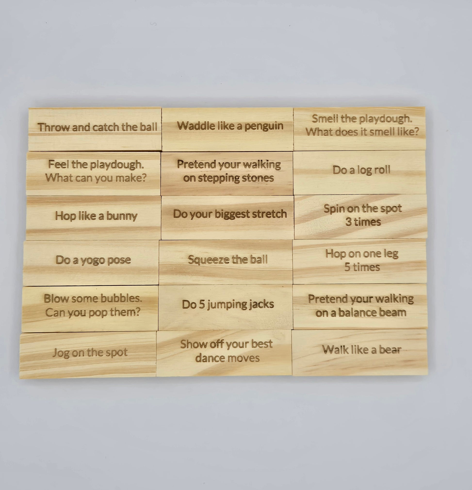 Inside the set you’ll find 54 wooden blocks, 18 of which are engraved in-house at Gracie Rose & Co, with fun actions, movement-based challenges and interactive ideas that encourage focus and playful connection.