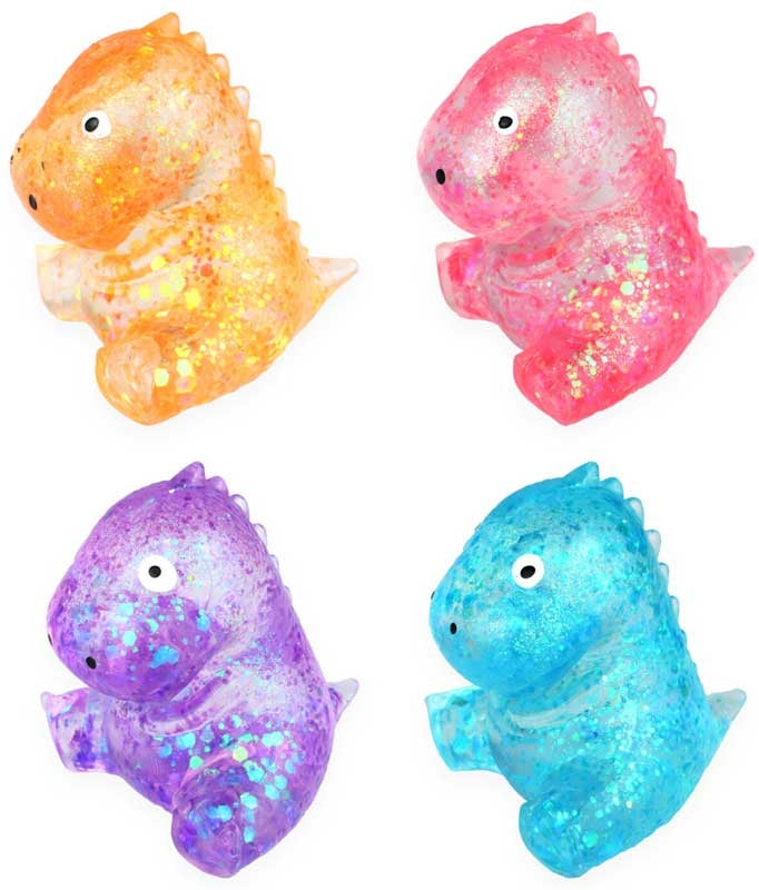 These squeezy dinosaur toys make ideal party favours for kids and sensory toys for people with ADHD, autism or anxiety. The squishy dino toys are filled with sugar gel and come in 4 colour variants: Blue, Green, Pink, Yellow.